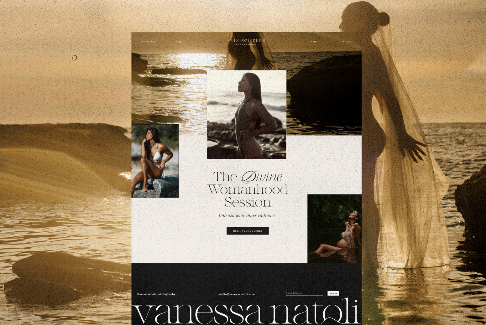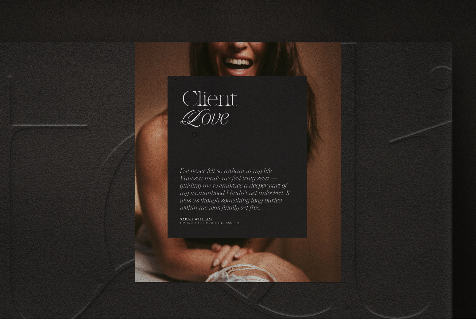We created a deeply evocative and luxurious backdrop that allowed the photography to shine and the emotion within each frame to lead. Light and depth informed the pacing and palette, while softness, restraint, and organic rhythm guided every design decision from the logo form to website.